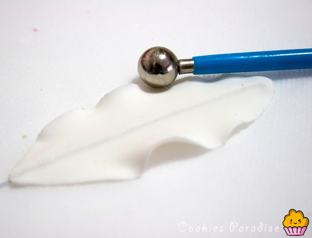Con el bolillo colocamos el pétalo encima de la alfombrilla y suavemente le alisamos y rizamos el borde. Trazamos una línea encima en el centro del pétalo.