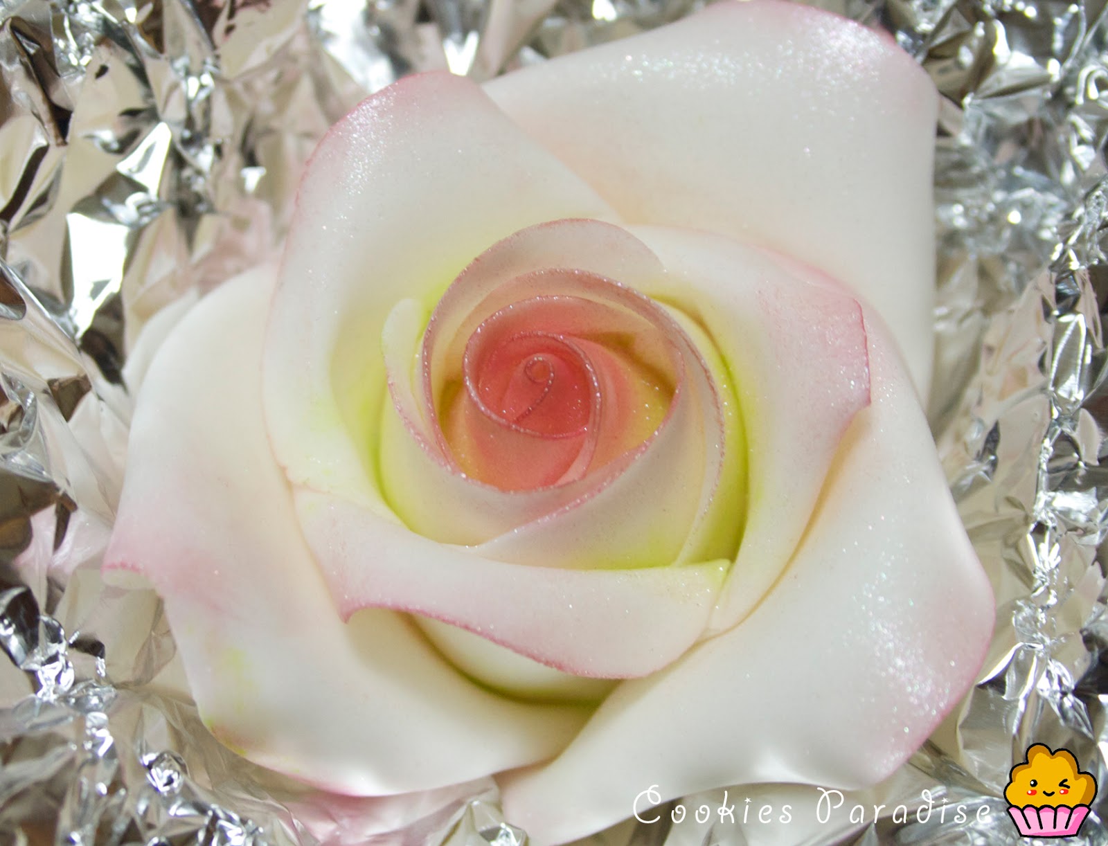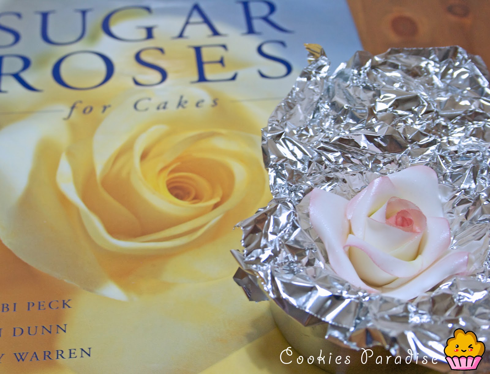 Mi tesorooooooo! En serio…a está rosa solo le falta oler a rosa! Es tán bonita! El modo de empezarla no és como aprendí en el curso pme…para hacerla me he fijado en el libro de Sugar Roses, hay muchas rosas y distintas formas de hacerlas.