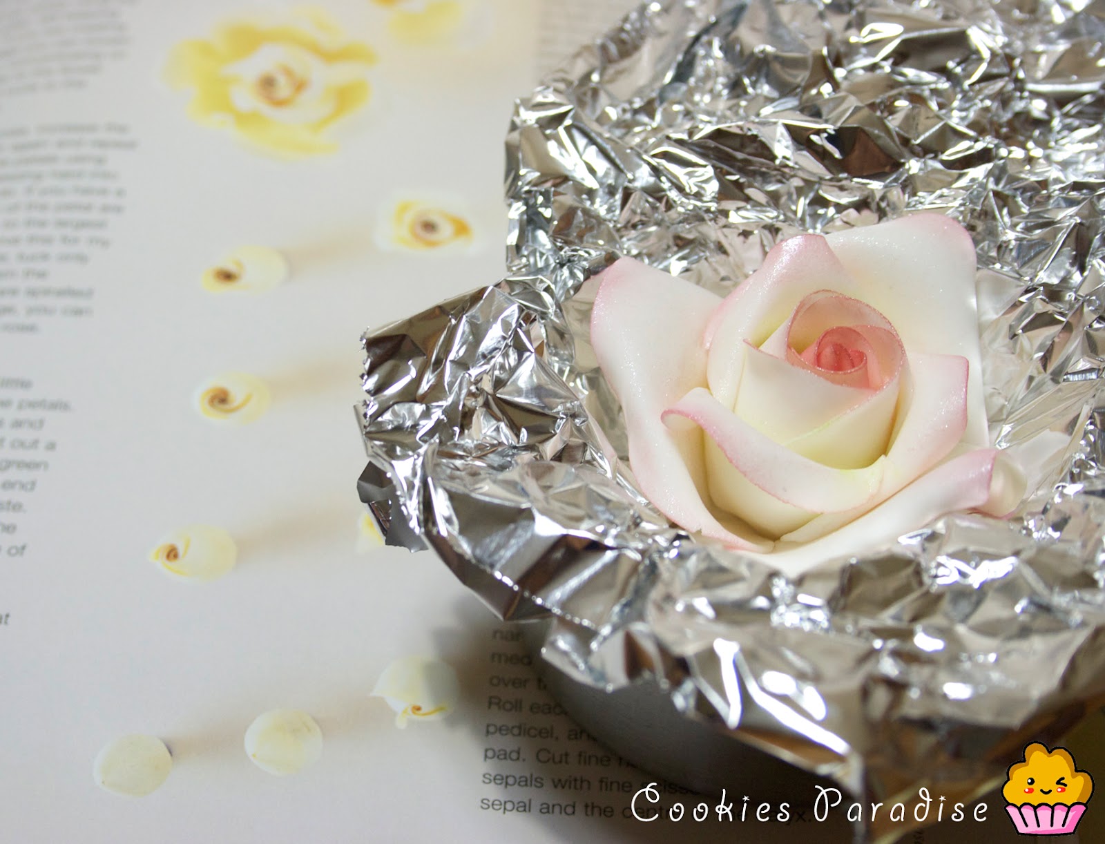 En la foto podeís ver que la puse dentro de una taza rodeada de papel de plata para que cojera forma y no se desprendieran los petalos. Al terminar la rosa siempre le quitamos la parte de abajo con un cuchillo para que nos que de más vajita y le damos un poco de forma con los dedos. Eso es todo, a que os gusta?