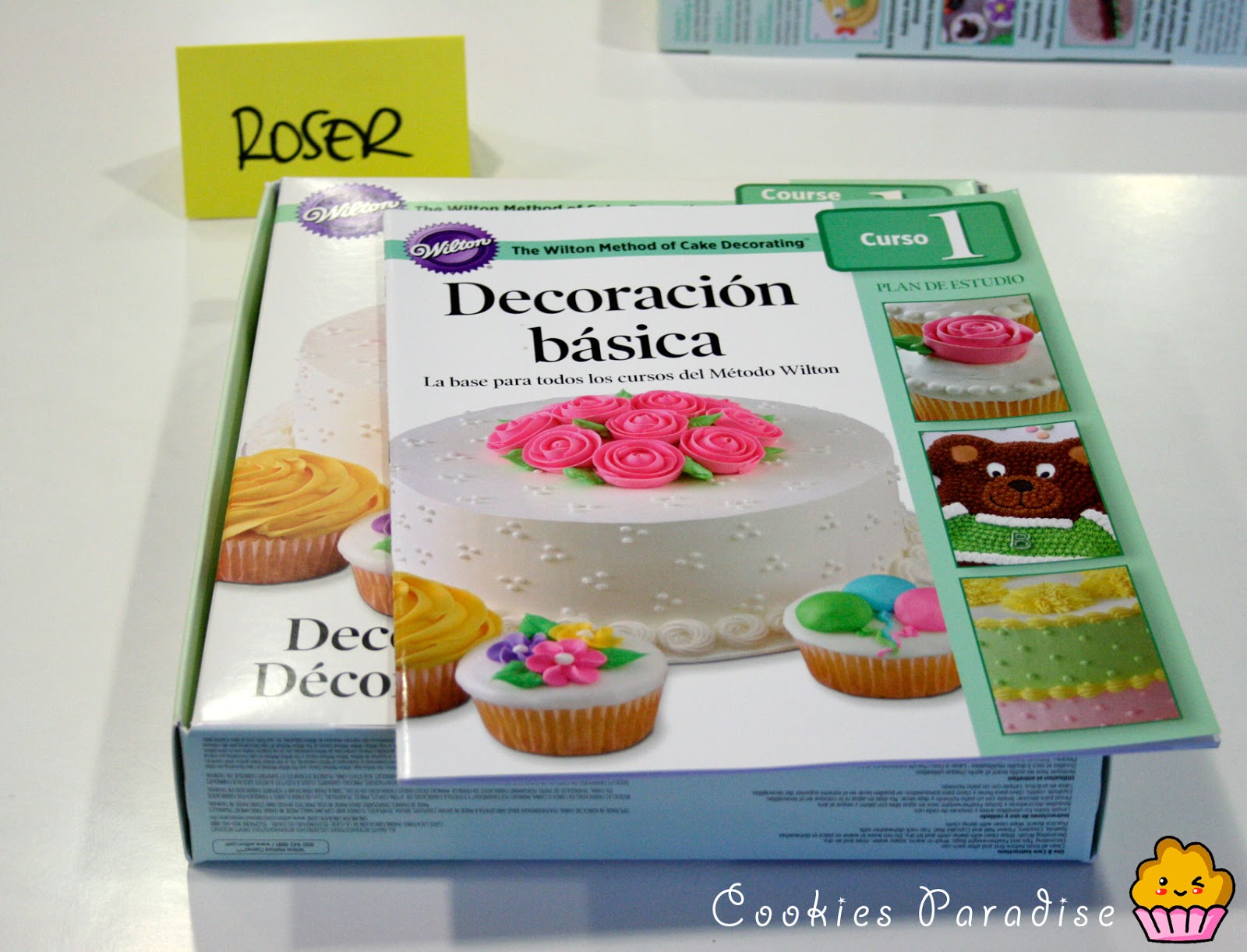 Esta fotografía la hice antes de sentarme, en la caja Wilton encontré todo el material necesario para realizar el curso y el libro correspondiente. En este curso he aprendido muchas cosas!! la forma adecuada de cojer la manga pastelera, la presión correcta y la textura perfecta para cada boquilla , nos pasamos el día prácticando con ella, haciendo conchas, hojas, rosas todo con crema de mantequilla, el final del día lo terminamos decorando el bizcocho que habíamos llebado, quedando una tarta preciosa y buenisima!!